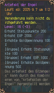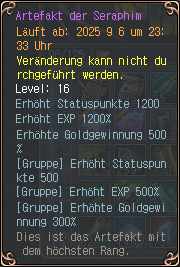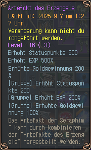 Hat ein Spieler mindestens 2x Artefakt der Engel, kann der diese bei „Sahaquiel [Artefakt Event]“ kombinieren zu dem Artefakt des Erzengels (100k Gold Kombinationskosten). Hat man beide Artefakte des Erzengels (also alle 4 Artefakte der Engel) kann man diese zu dem Artefakt der Seraphim kombinieren (500k Gold Kombinationskosten).