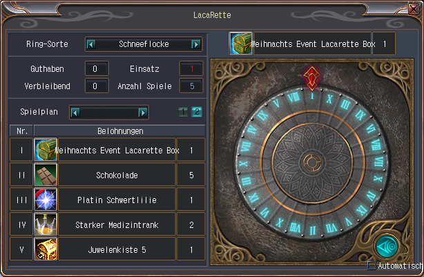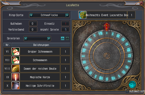 eintauschen. NUR wenn man diese anzieht, kann man in Juno und in Tarian zufällig verteilt "Schneehaufen" sehen, und diese Abbauen. Dabei erhält man Schneeflocken. Diese Schneeflocken kann man "Sarayan [Event-NPC]" bei einem LacaRette für folgende Gewinne verspielen. Der NPC ist zwischen Mondsteinstatue und Idele. Als Einsatz benötigt man 1 Schneeflocke pro Versuch.