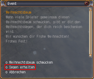 Man droppt 6 verschiedene Weihnachtsbaumdekorationen, mit denen man den Weihnachtsbaum dekorieren kann. Je nachdem wie sehr der Baum von der Community geschmückt wurde verlängert sich dieser Buff: